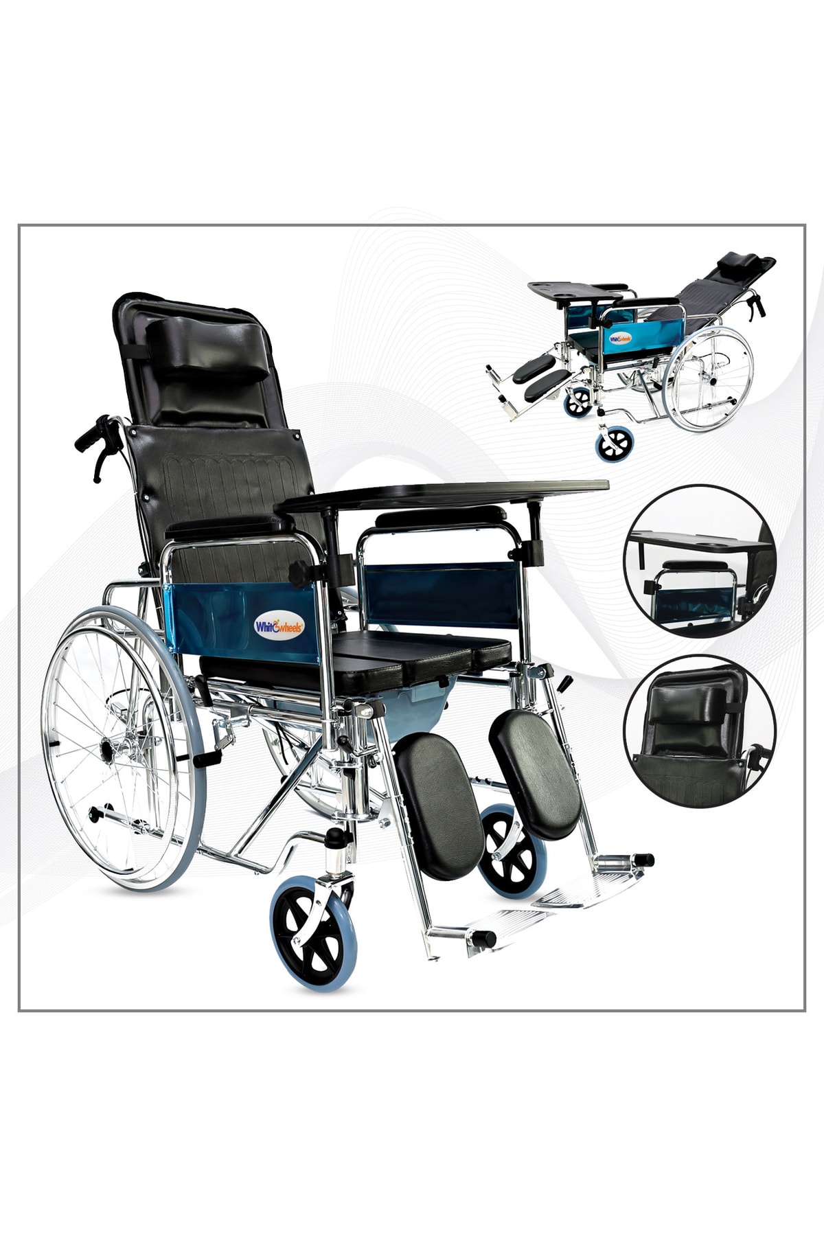 • Kromajlı çelik boru • Ayak çıkabilir • Kollar kalkar • Sırt yatırılabilir • 8″ PVC ön teker • 24″ dolgu arka teker • Yüksekliği ayarlanabilir ayak • Baldır destekli • Portatif lazımlık • Alüminyum pedal